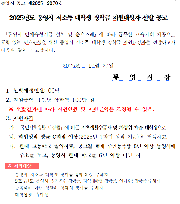 2025³âµµ Å뿵½Ã Àú¼Òµæ ´ëÇлý ÀåÇÐ±Ý Áö¿ø´ë»óÀÚ ¼±¹ß ¾È³»