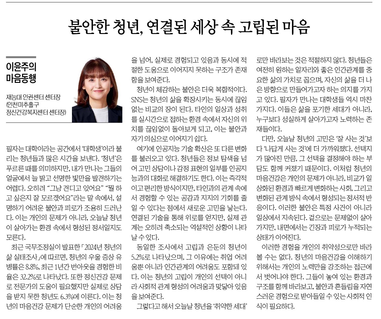 ´Ù¸¸, ¿À´Ã³¯ û³âÀÇ °í¹ÎÀº ‘Àß »ç´Â °Í’º¸´Ù ‘³ª´ä°Ô »ç´Â °Í’¿¡ ´õ °¡±î¿öÁ³´Ù. ¼±ÅÃÁö°¡ ¸¹¾ÆÁø ¸¸Å­, ±× ¼±ÅÃÀ» °áÁ¤ÇØ¾ß ÇÏ´Â ºÎ´ãµµ ÇÔ²² Ä¿Á³±â ¶§¹®ÀÌ´Ù. ÀÌó·³ û³âÀÇ ¸¶À½°Ç°­Àº °³ÀÎÀÇ ¹®Á¦°¡ ¾Æ´Ï¶ó, ºñ±³°¡ ÀÏ»óÈ­µÈ ȯ°æ°ú ºü¸£°Ô º¯È­ÇÏ´Â »çȸ, ±×¸®°í º¯È­µÈ °ü°è ¹æ½Ä ¼Ó¿¡¼­ Çü¼ºµÇ´Â Á¤¼­Àû ¹ÝÀÀÀÌ´Ù. ÀÌ·¯ÇÑ ºÒ¾ÈÀº ƯÁ¤ »ç°ÇÀÌ ¾Æ´Ï¶ó Àϻ󿡼­ Áö¼ÓµÈ´Ù. °ÑÀ¸·Î´Â ¹®Á¦¾øÀÌ »ì¾Æ°¡Áö¸¸, ³»¸é¿¡¼­´Â ±äÀå°ú ÇǷΰ¡ ´©ÀûµÇ´Â »óŰ¡ À̾îÁø´Ù.