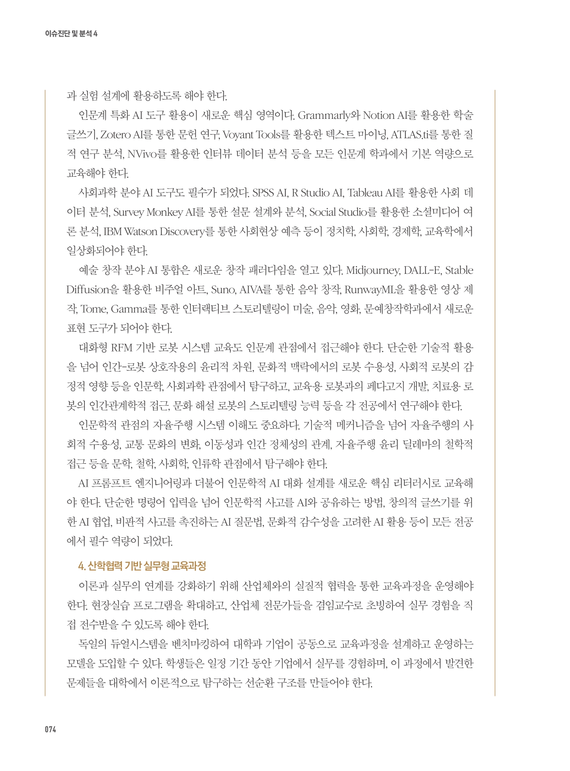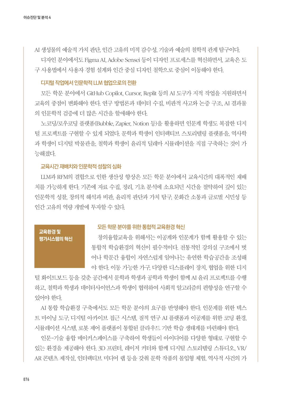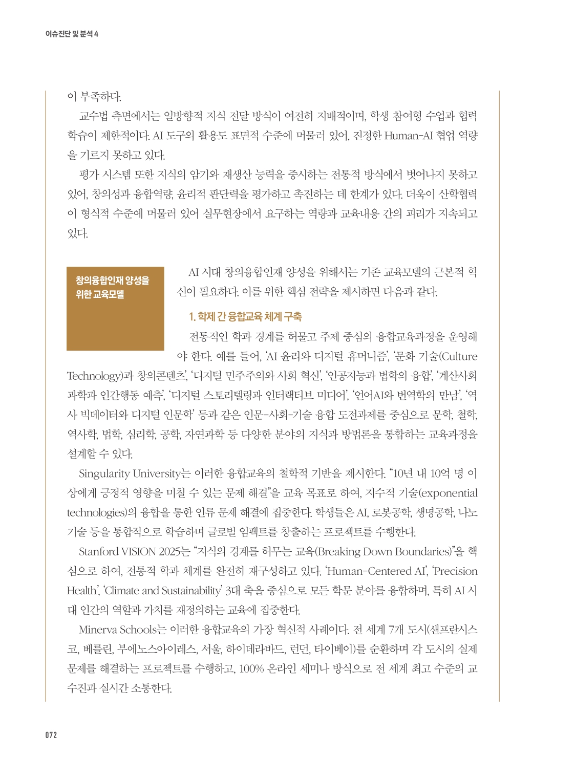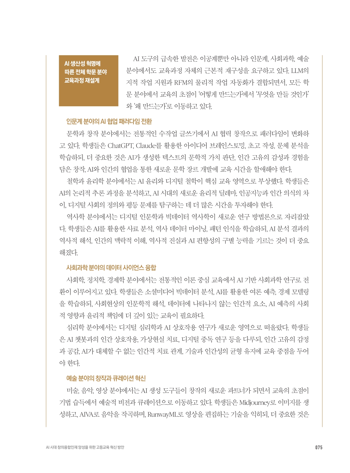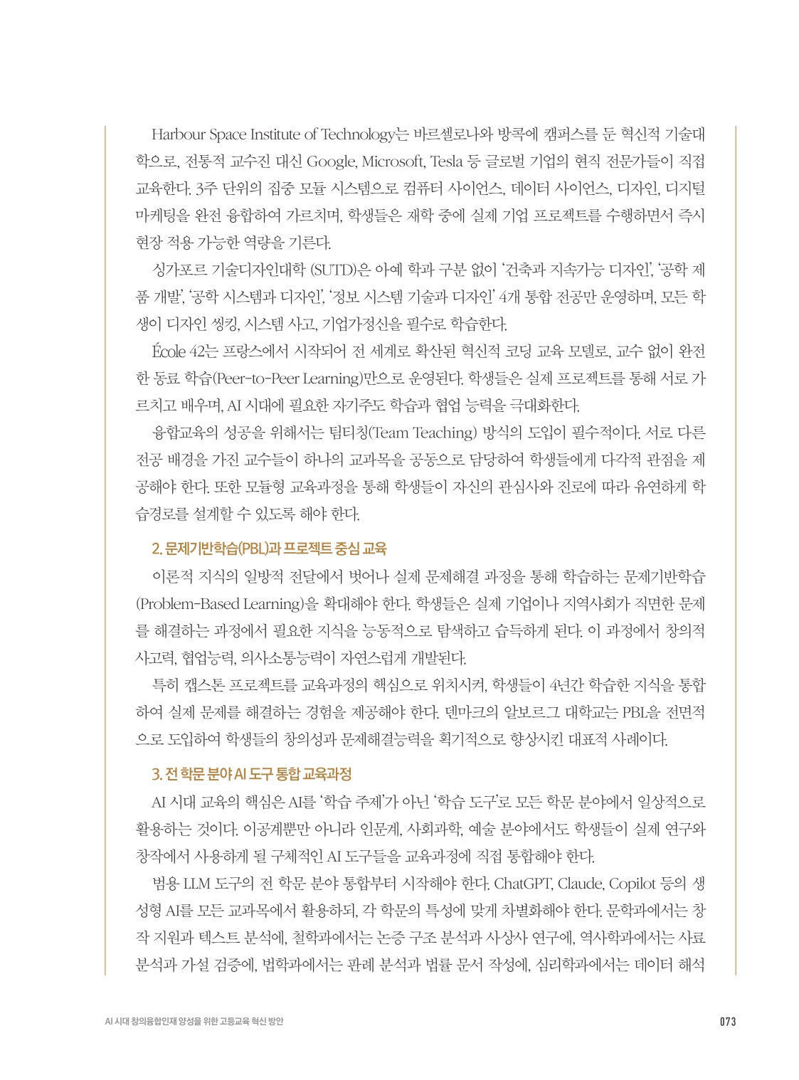 ¶ÇÇÑ ¡ãÇÐÁ¦ °£ À¶ÇÕ±³À° ü°è ±¸Ãà ¡ã¹®Á¦±â¹ÝÇнÀ(PBL)°ú ÇÁ·ÎÁ§Æ® Á᫐ ±³À° È®´ë ¡ãÀü Çй® ºÐ¾ß¿¡¼­ÀÇ AI µµ±¸ ÅëÇÕ ¡ã»êÇÐÇù·Â ±â¹Ý ½Ç¹«Çü ±³À° °­È­ µîÀ» ±¸Ã¼ÀûÀÎ Çõ½Å Àü·«À¸·Î Á¦½ÃÇß½À´Ï´Ù. ƯÈ÷ AI¸¦ ´Ü¼øÇÑ ÇнÀ ÁÖÁ¦°¡ ¾Æ´Ñ ‘¸ðµç Çй® ºÐ¾ß¿¡¼­ Ȱ¿ëµÇ´Â ÇнÀ µµ±¸’·Î ÀνÄÇØ¾ß ÇÑ´Ù°í °­Á¶Çß½À´Ï´Ù.